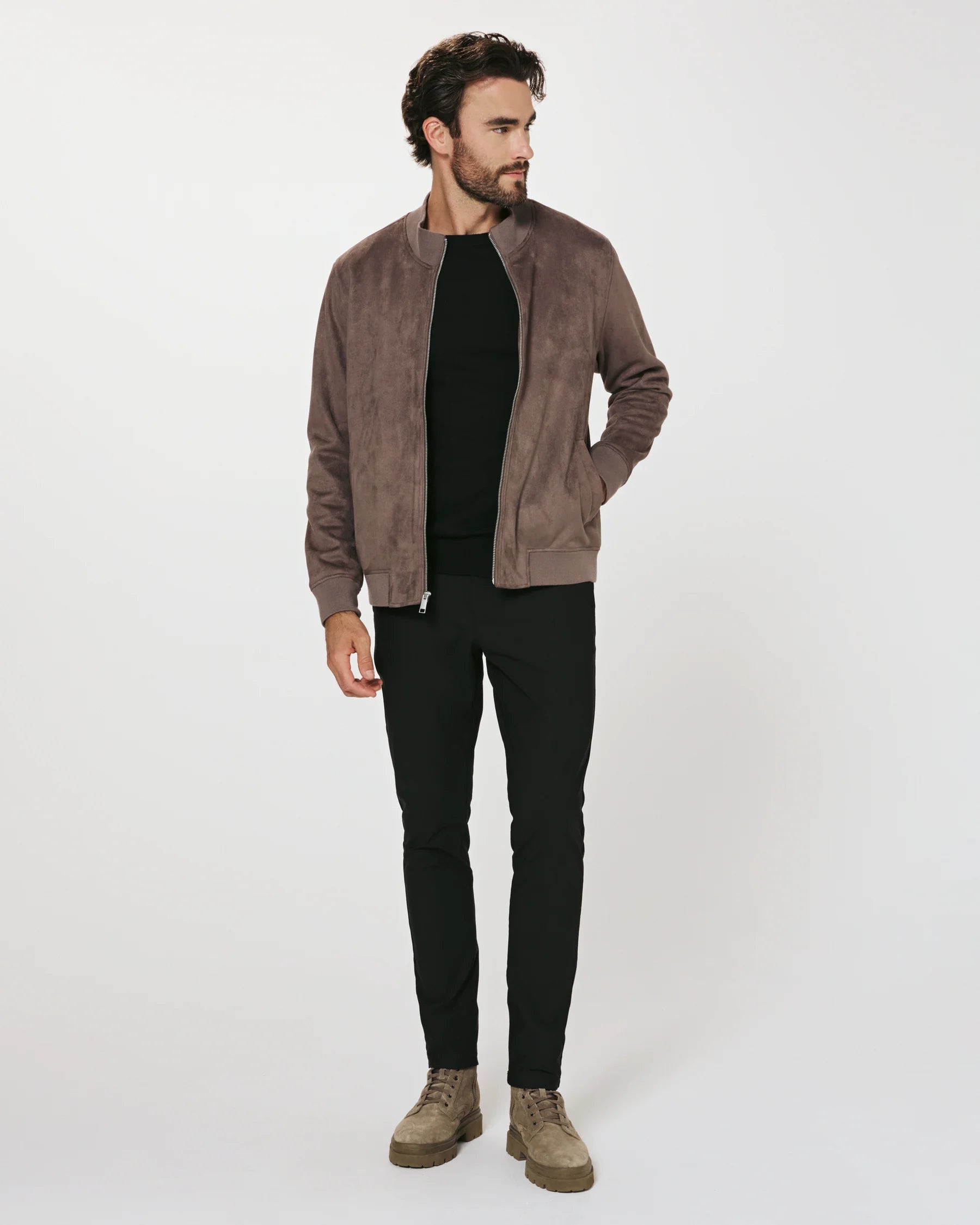 Minimalist with a soft-touch. Classic suede-feel to deliver a statement. Ribbed detailing at the collar and cuffs add tailored edge, along with discreet functional side pockets. Style with a tee and pants for an elevated outfit.